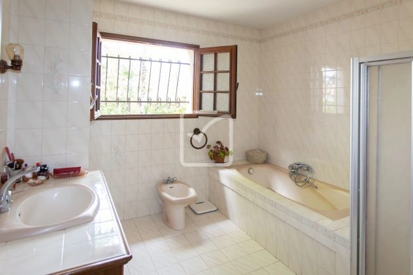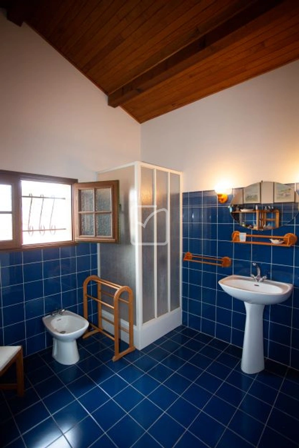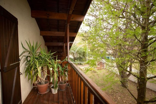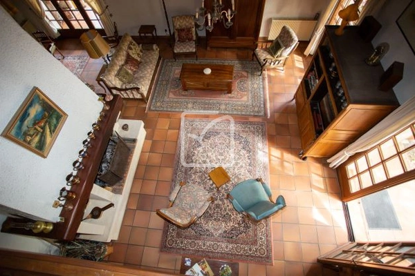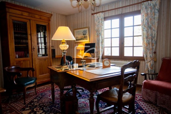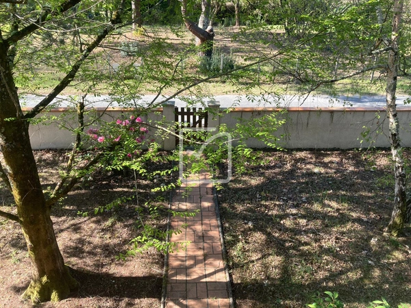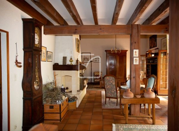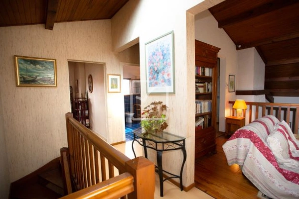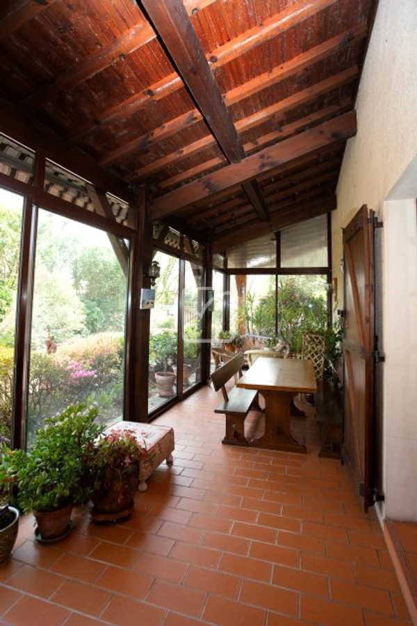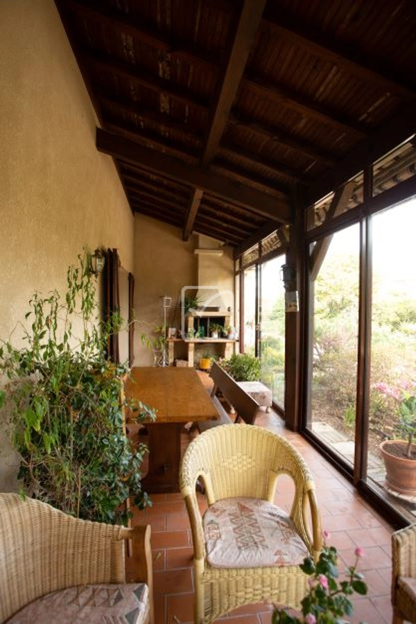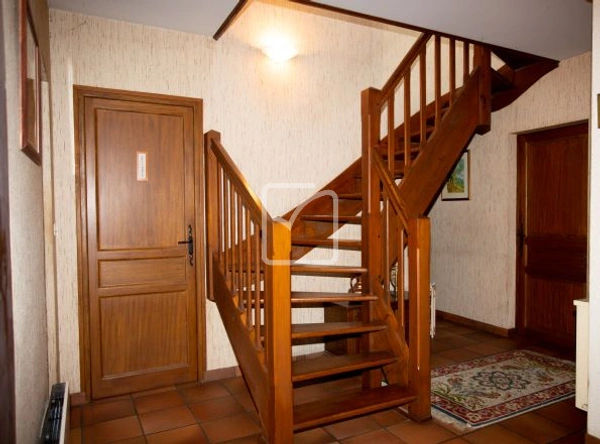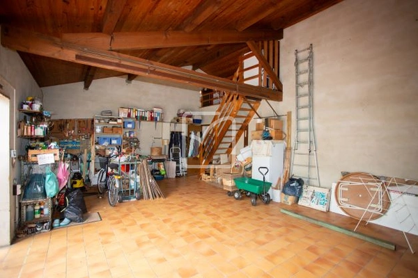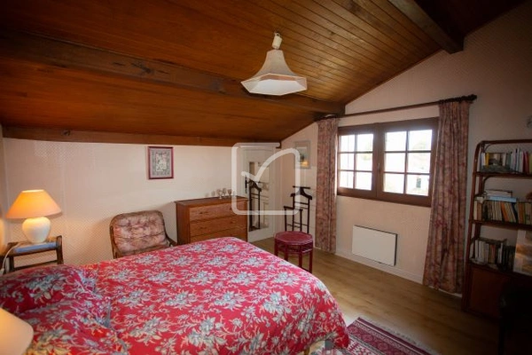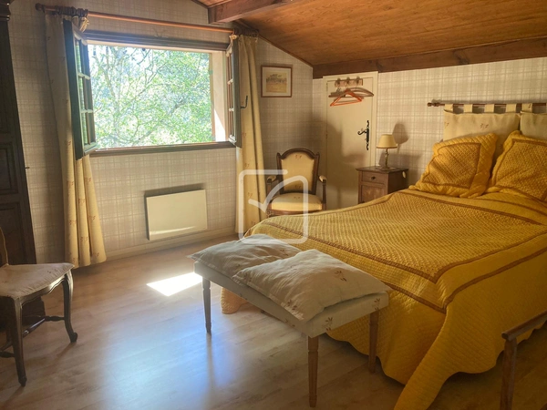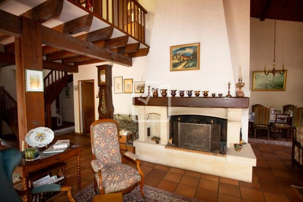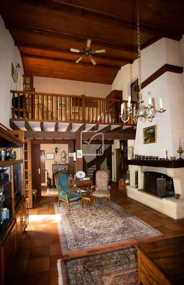 L'habitation de type T6 d'une surface de 209 m2 comprend, au rez-de chaussée, un hall d'entrée ouvrant sur un grand salon séjour cheminée (avec récupérateur de chaleur) et une salle à manger (sud-ouest) qui donne sur une belle véranda fermée avec cheminée. Le hall d'entrée se prolonge à l'ouest par un dégagement qui dessert deux chambres (sud-ouest et nord-ouest), une salle de bain avec baignoire et douche ; un cabinet de toilette indépendant avec lave-main extérieur. Au centre, le hall d'entrée dessert également une cuisine indépendante aménagée & équipée, à l'arrière de laquelle se trouvent un cellier, une buanderie (avec accès eau) et une cave ; puis un grand garage attenant de 48 m2 avec mezzanine/combles. Ces combles en deux parties au-dessus du cellier et de la buanderie sont aménagés et accessibles par un escalier en bois de pin installé dans le garage. Les plafonds des séjour salle à manger et garage sont lambrissés (sous rampants), ceux du hall d'entrée et des celliers et buanderie sont en aggloméré peint posé sur chevrons apparents (poutres de pin). Au 1er étage, la cage d'escalier en bois de pin (escalier meunier) s'ouvre sur un dégagement qui dessert deux chambres mansardées (sud-ouest et nord-ouest) avec extension placards à l'arrière du mur, un coin bureau mansardé, une salle d'eau avec douche, un cabinet de toilette indépendant et une mezzanine. Cette mezzanine plongeant au-dessus du salon cheminée est protégée du vide séjour par une rambarde en bois de pin, et se prolonge par un balcon en bois de pin en façade sud (extérieur). Tous les plafonds sous rampant à l'étage sont lambrissés. Le sol de toutes les pièces, y compris le garage, le cellier et la buanderie, est carrelé de larges tommettes méridionales, sauf celui de la chambre sud-ouest couvert d'un parquet mosaïque en châtaigner. Parquet à l'étage sauf moquette dans le coin bureau. Les murs du hall séjour salle à manger sont en crépis ; ceux des deux salles de bain sont recouverts de faïences, ceux des chambres et coin bureau sont tapissés.