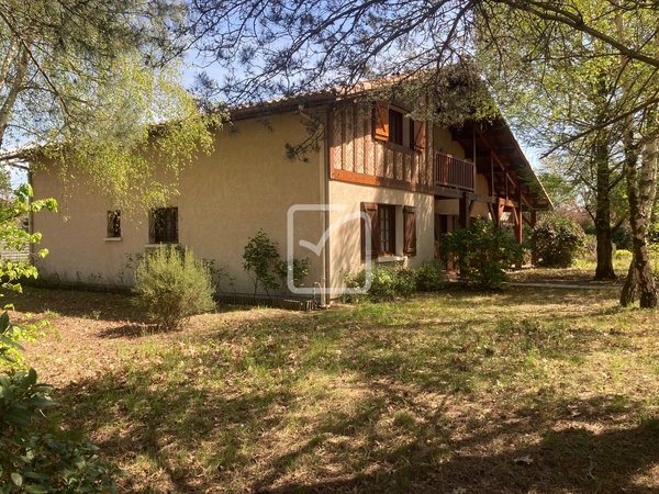 BISCARROSSE BOURG : Dans quartier recherché à 5 mn à pied du centre-bourg belle maison landaise traditionnelle à la charpente en bois de pin et à la façade à colombages garnis de briquettes disposées en fougère. Une terrasse couverte, carrelée au sud protège l'accès de la maison ; allée terrassée à l'est de la maison.