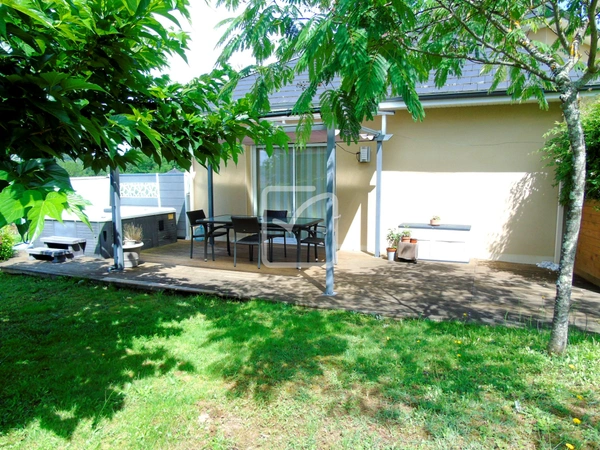Elle est composée en rez de chaussée d'une cuisine équipée s'ouvrant sur un vaste salon, salle à manger, une chambre parentale avec salle d'eau et WC, le tout donnant sur une terrasse couverte avec son jacuzzi 6 personnes et un terrain de 1100 m2 avec une vue dégagée sur Brive.