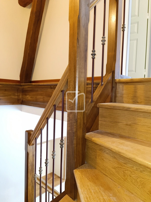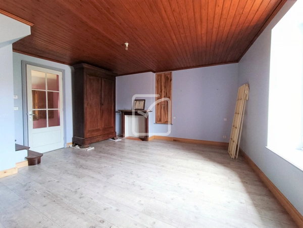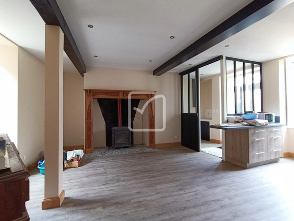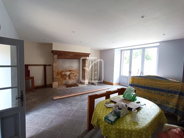 - au rez de chaussée : entrée avec placard, cuisine aménagée et équipée avec cheminée et poele à bois, salon avec cheminée foyer ouvert, wc séparé.