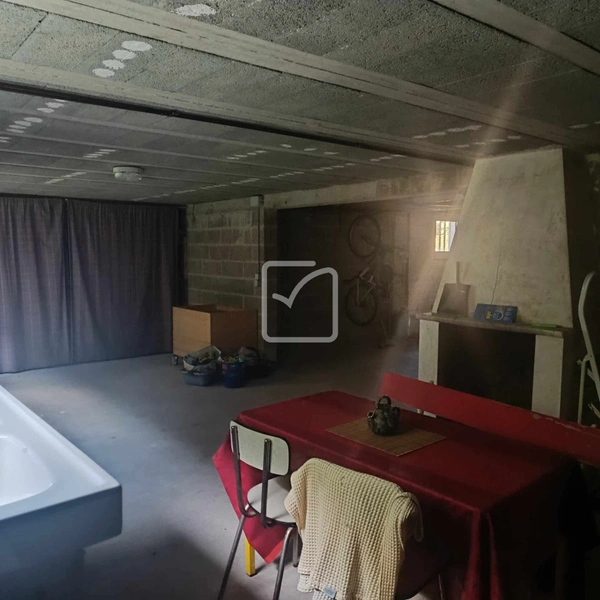 Un grand garage ouvert sur une grande pièce avec une cheminée , pouvant acceuillir vos soirées barbecue entre amis