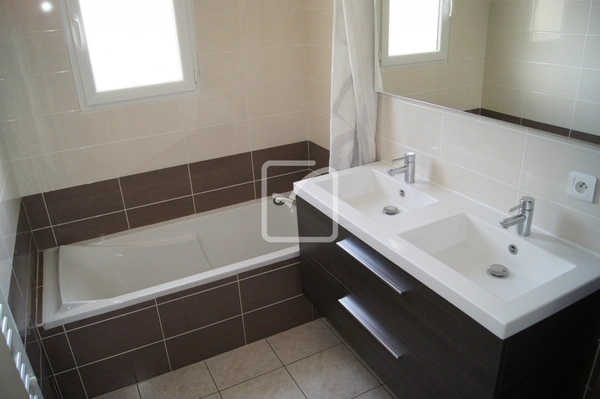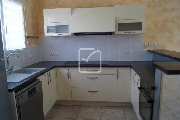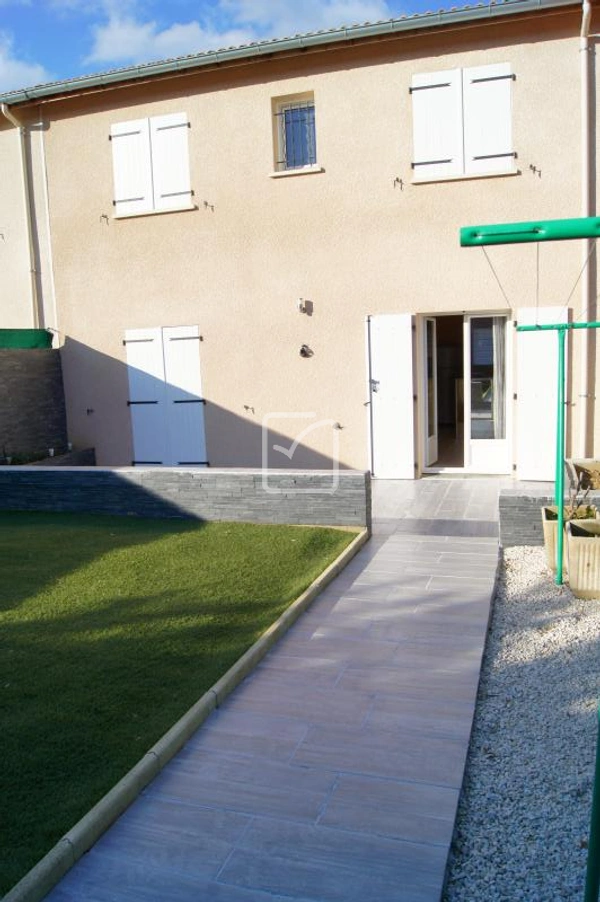 Maison année 2011 agréablement lumineuse comprenant: cuisine équipée ouverte sur séjour, cellier-buanderie, wc. A l'étage: 3 chambres avec placards muraux, salle de bain, wc indépendant. Garage, panneaux photovoltaïques sur toit pour production d' éléctricité. Cette maison est implantée sur un terrain de 208 m2 avec terrasse carrelée, jardin et cour. Places de parking privées et aussi commune devant la maison.