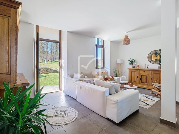 D'une surface habitable de 110 m2, elle se compose au rez-de-chaussée d'une entrée avec placard, de WC séparés, et d'un bel espace de vie comprenant salon, salle à manger et cuisine ouverte. Le tout donne accès à une grande terrasse exposée plein sud, ainsi qu'à un jardin bordé de forêt. L'environnement est calme, champêtre, sur un terrain de 2223 m2 entièrement agricole. Une buanderie et chaufferie complètent ce niveau.