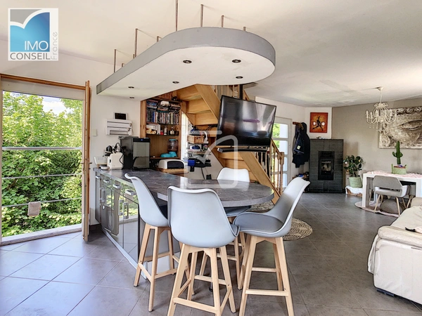 Au rez-de-chaussée : un séjour cuisine de 35 m2 avec poêle à granules.