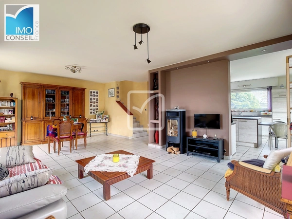 Très lumineuse, elle dispose de 4 chambres, 1 salle de bains, 1 salle d'eau avec WC, un WC séparé, un espace salon-séjour avec cuisine ouverte et poêle à bois. Le salon et la cuisine donnent directement sur la terrasse bien exposée.