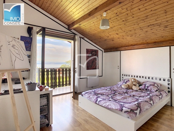 Au 1er étage, 3 chambres avec placards dont 2 avec balcon donnant sur le lac, une salle d'eau avec WC.