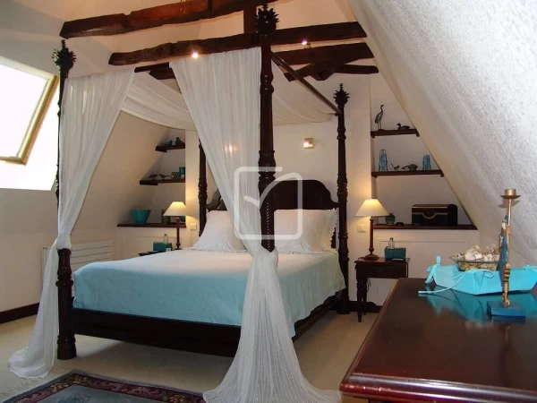 De plein pied, une imposante chambre avec son coin salon, rangements, salle de bain. l'étage le lien avec la chambre se fait par une pièce pouvant servir de chambre ou bureau, chambre avec salle de bain et trés spacieux dressing.Grands Garages, aménagés et carrelés, aux fermetures electriques.