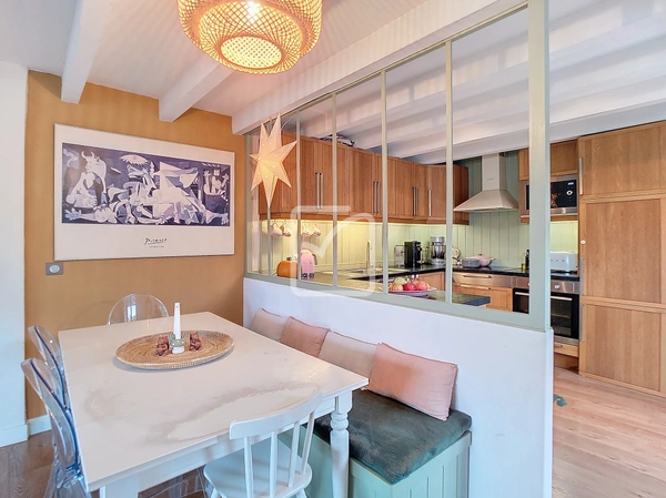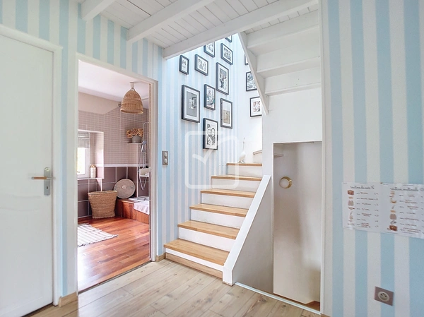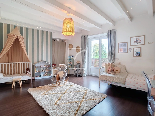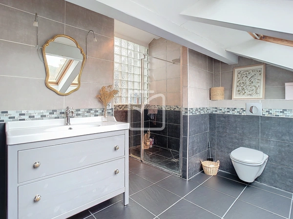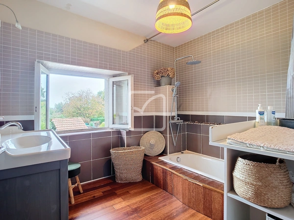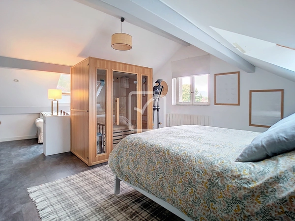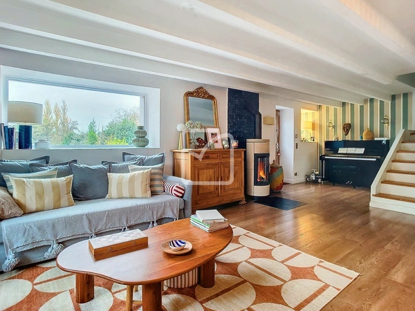 Dès l'entrée, vous serez séduit par le vaste séjour baigné de lumière, équipé d'un poêle à bois, qui se prolonge harmonieusement sur une cuisine entièrement équipée. Toujours au rez-de-chaussée, un cellier pratique et un WC séparé complètent les espaces de vie.