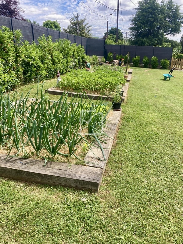 Potagers, arbres fruitiers, bassin de récupération d'eau, abri de jardin
