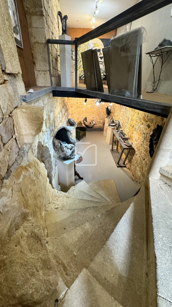 Rez-de-rue :Galerie d'Art d'environ 55,31m2 avec poutres apparentes & murs en pierres répartis sur 2 niveaux par un escalier à vis en pierre.