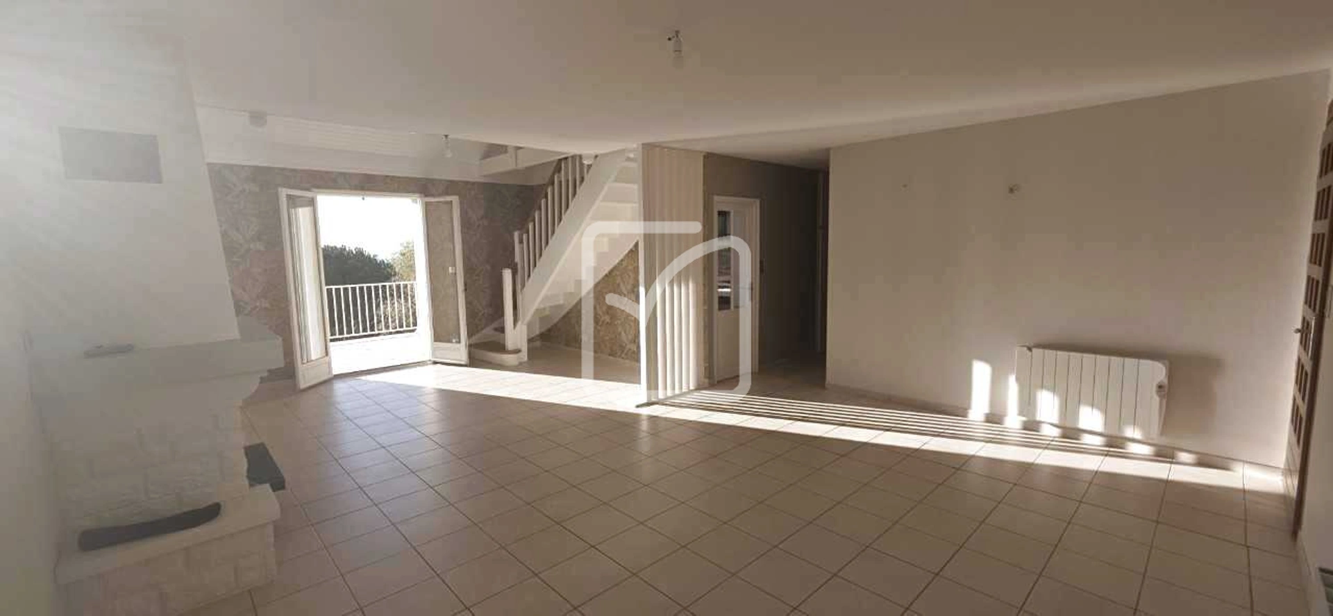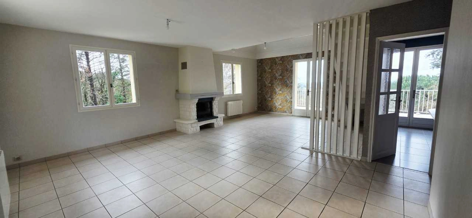 La maison s'ouvre sur une vaste pièce de vie traversante agrémentée d'une cheminée. Une porte fenêtre donne accès à une vue imprenable sur la campagne boisée sans vis-à-vis.
