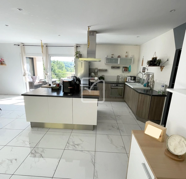 Elle est composée d'une vaste pièce de vie, une cuisine équipée ouverte avec un îlot central, une arrière cuisine, un grand salon/salle à manger avec un poêle à bois, donnant sur une belle terrasse de 40m2 (au sud) avec vue imprenable ainsi qu'une 2ème au nord.