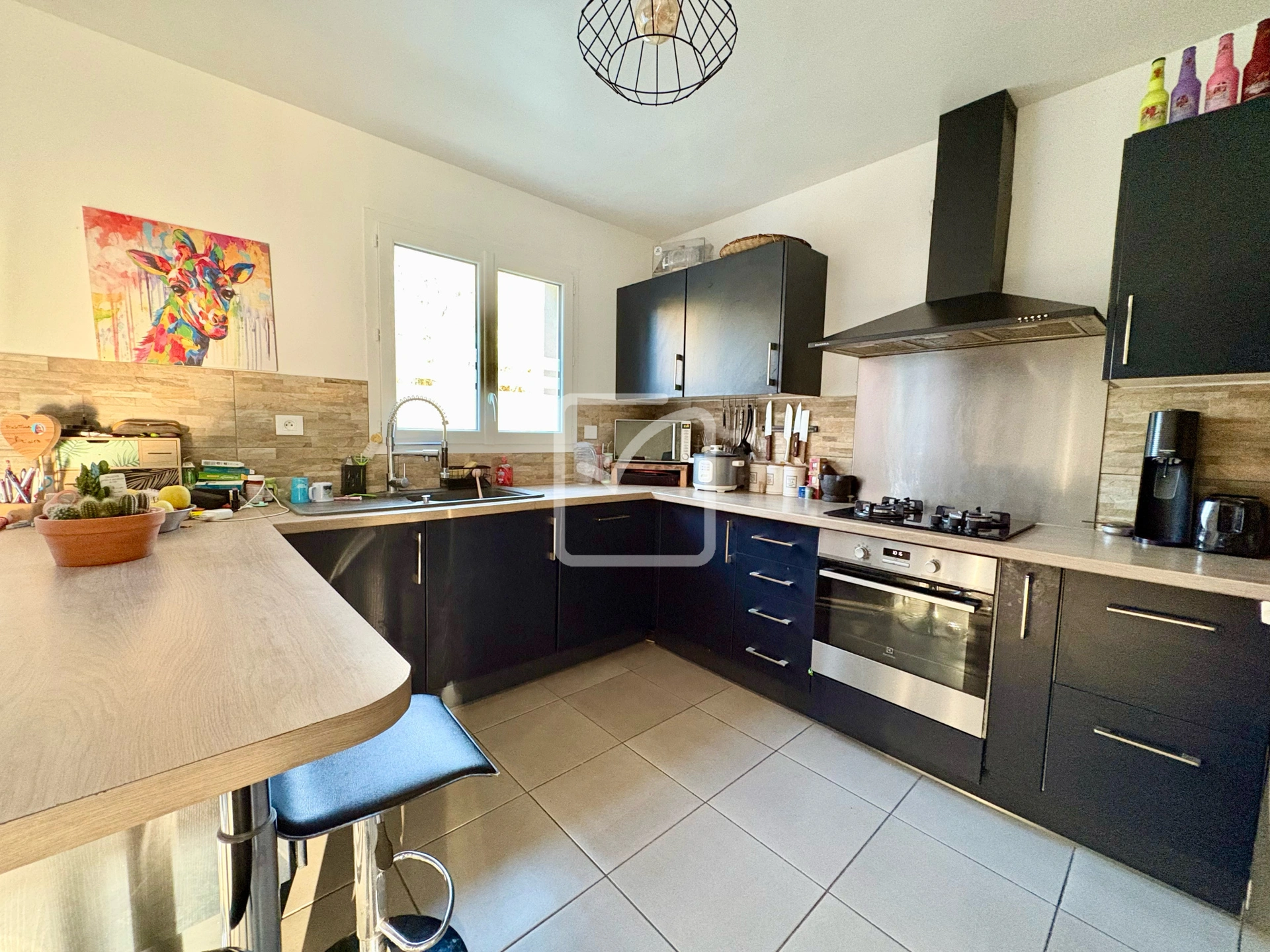 Elle se compose d'une pièce de vie lumineuse avec sa cuisine ouverte équipée et son accès à la terrasse, de trois chambres, d'une salle de bain et WC.