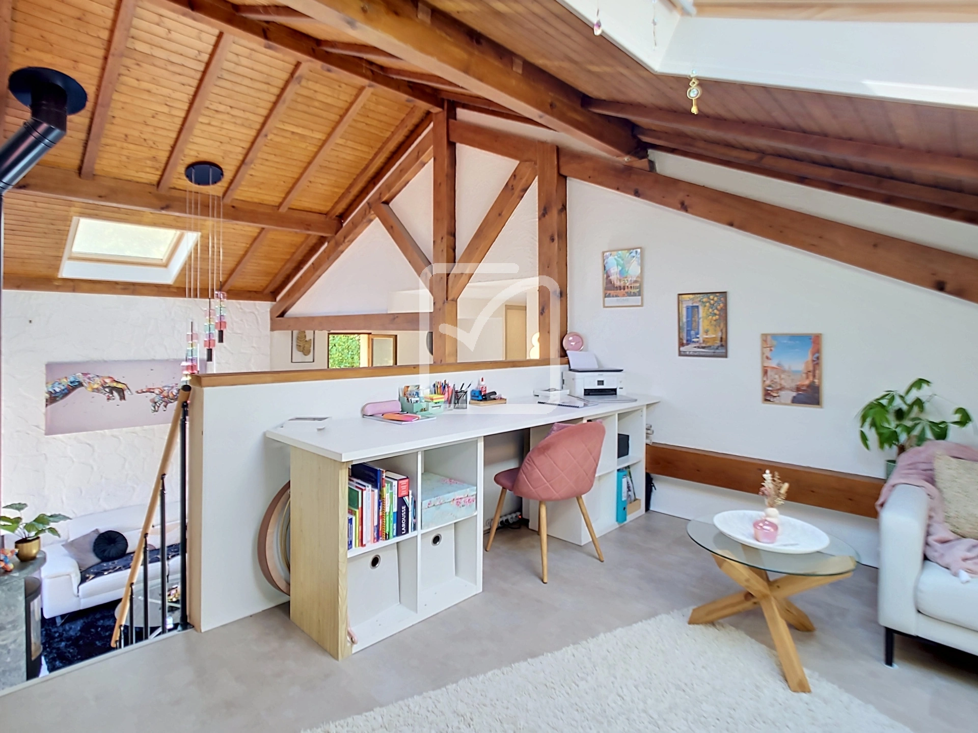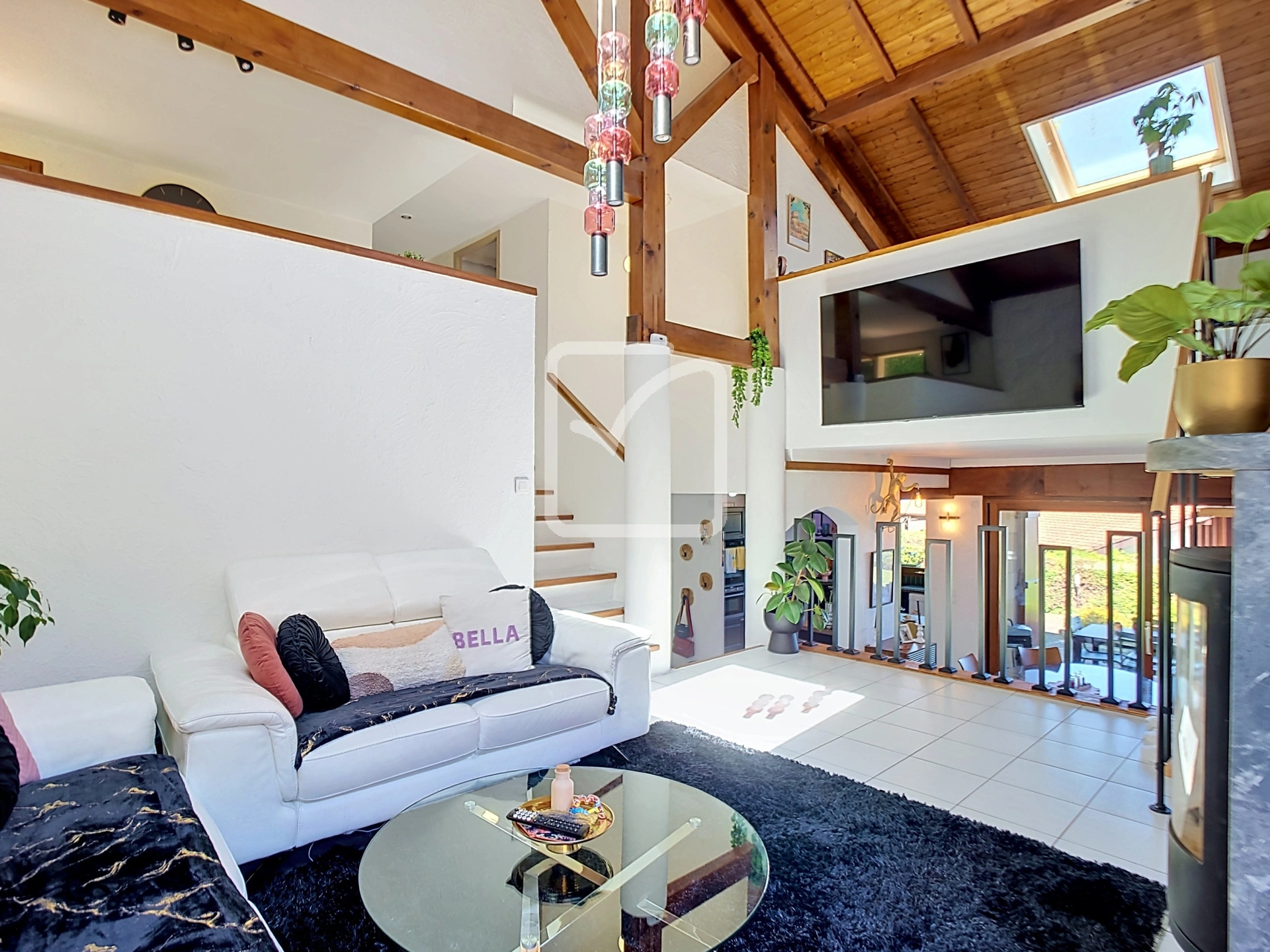 En quelques marches, le demi-niveau dévoile un salon avec plafond cathédrale, offrant espace, volume et charme.