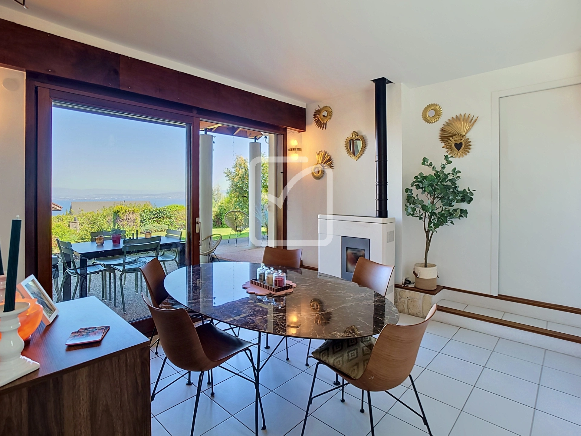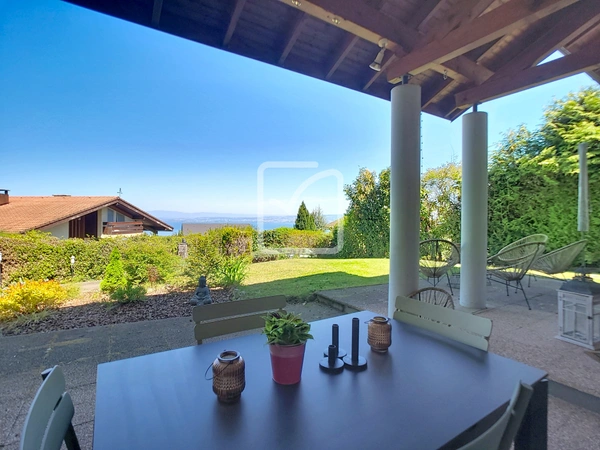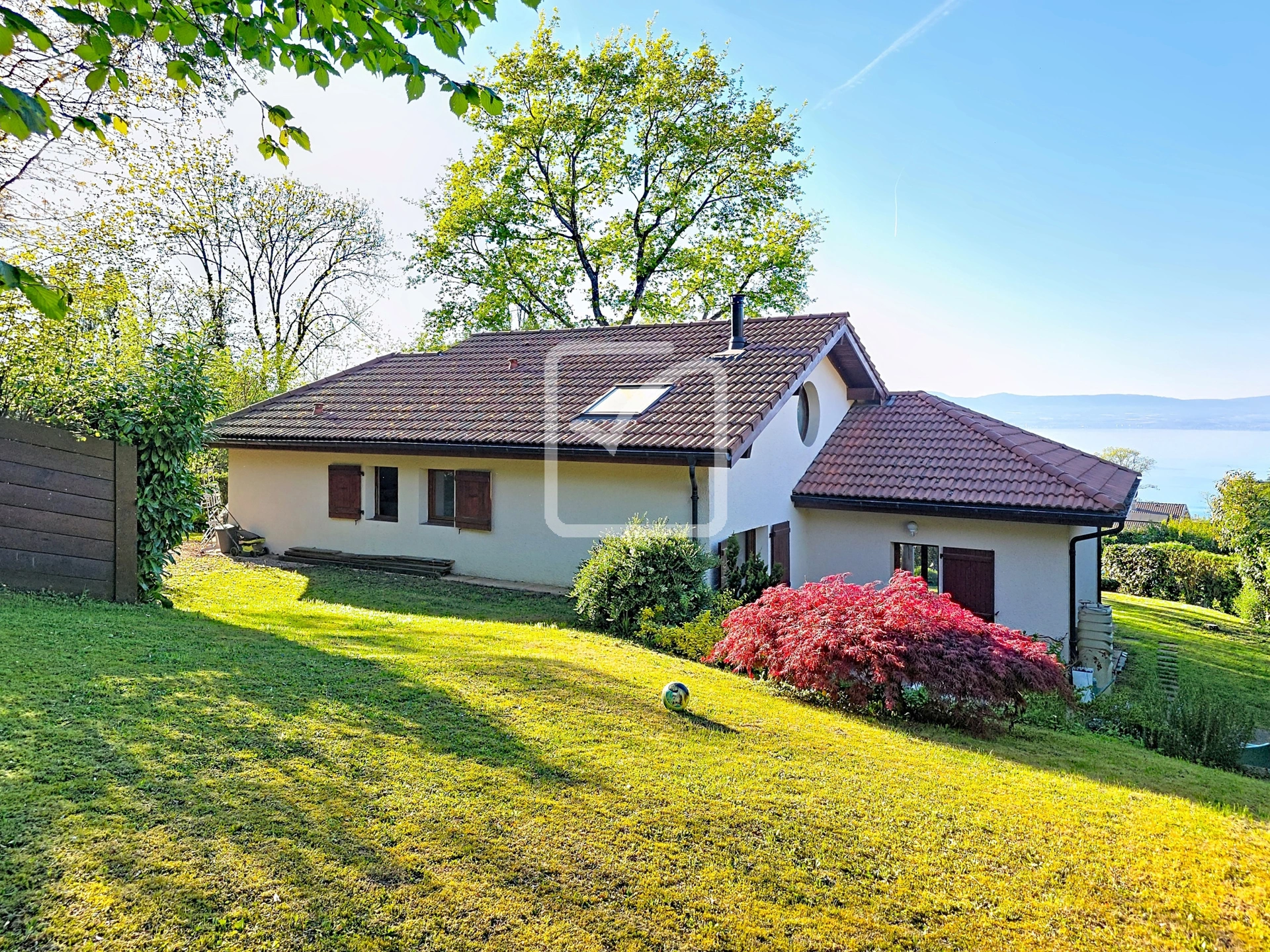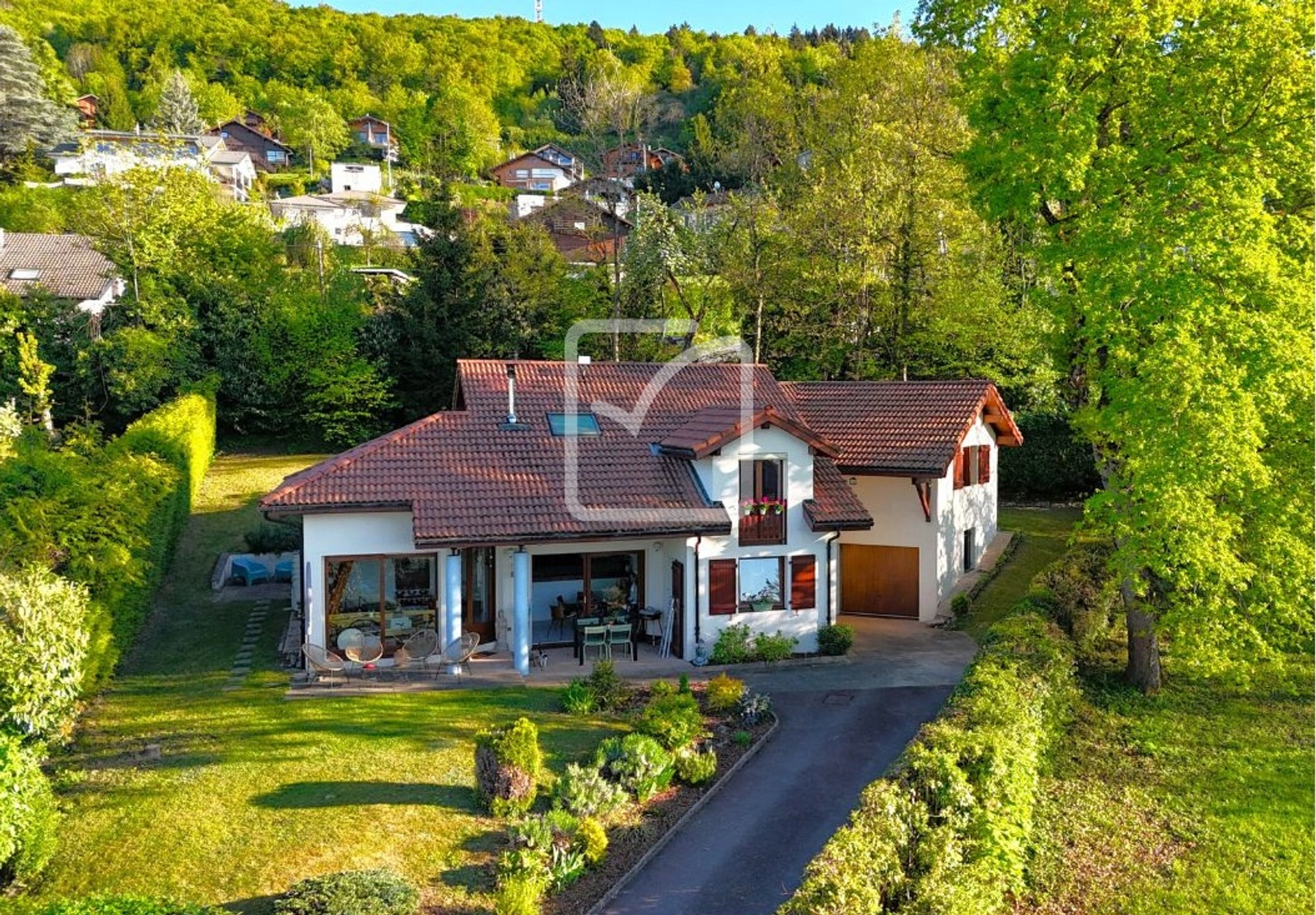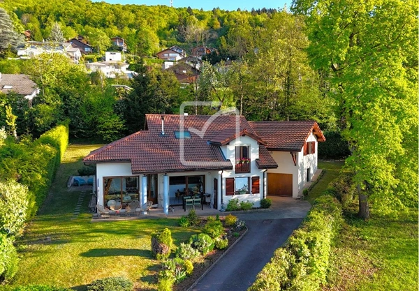 Sur les hauteurs d'Évian-les-Bains, au fond d'une impasse privée à l'abris des regards, cette maison d'architecte de 153m2 / 193 m2 utiles, s'inscrit dans un environnement résidentiel recherché, bénéficiant d'une belle vue sur le lac.