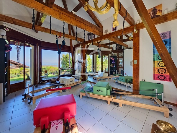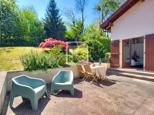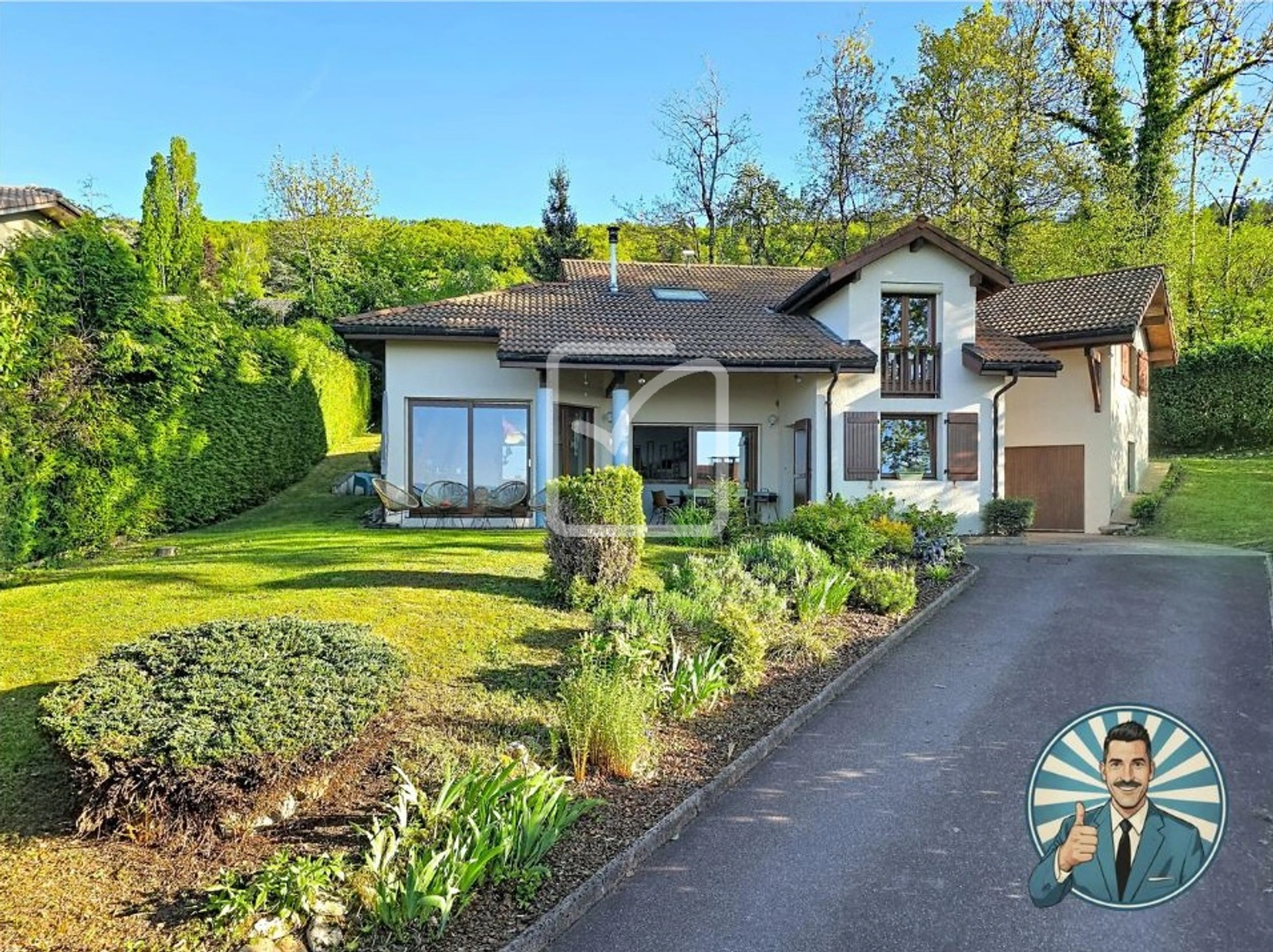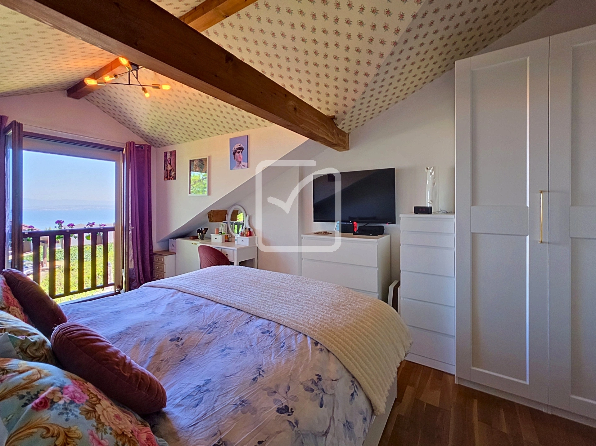 Sur les hauteurs d'Évian-les-Bains, au fond d'une impasse privée à l'abris des regards, cette maison d'architecte de 153m2 / 193 m2 utiles, s'inscrit dans un environnement résidentiel recherché, bénéficiant d'une belle vue sur le lac.