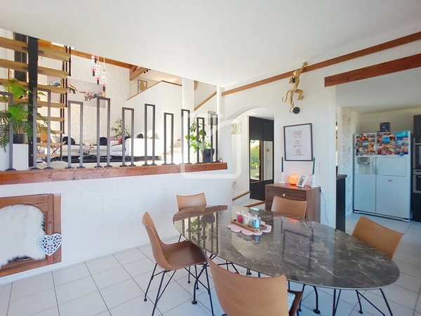Dès l'entrée, les espaces de vie s'ouvrent naturellement : une cuisine semi-ouverte prolongée par la salle à manger, tournée vers une terrasse avec vue sur le lac, invitant à profiter pleinement des extérieurs.
