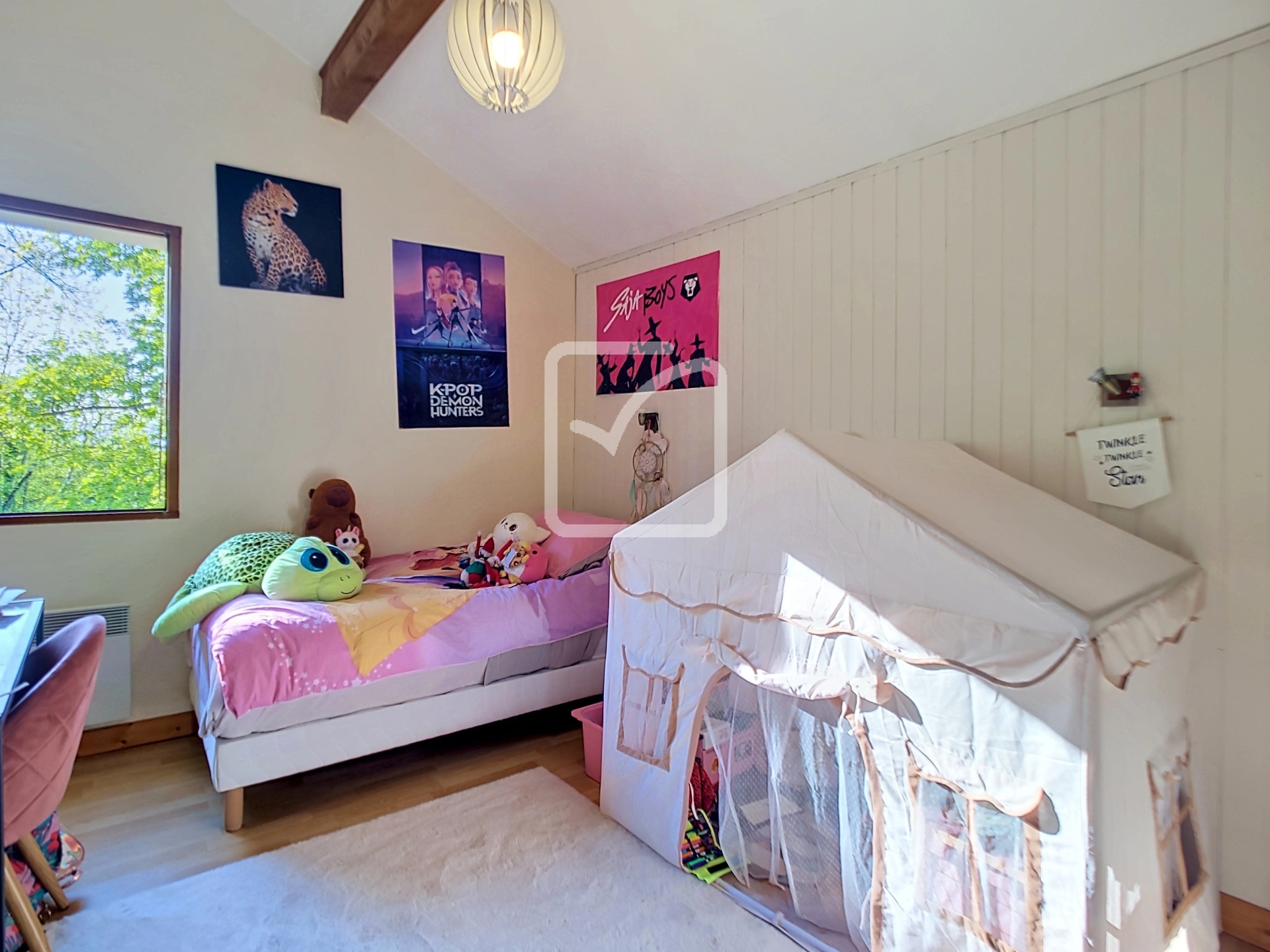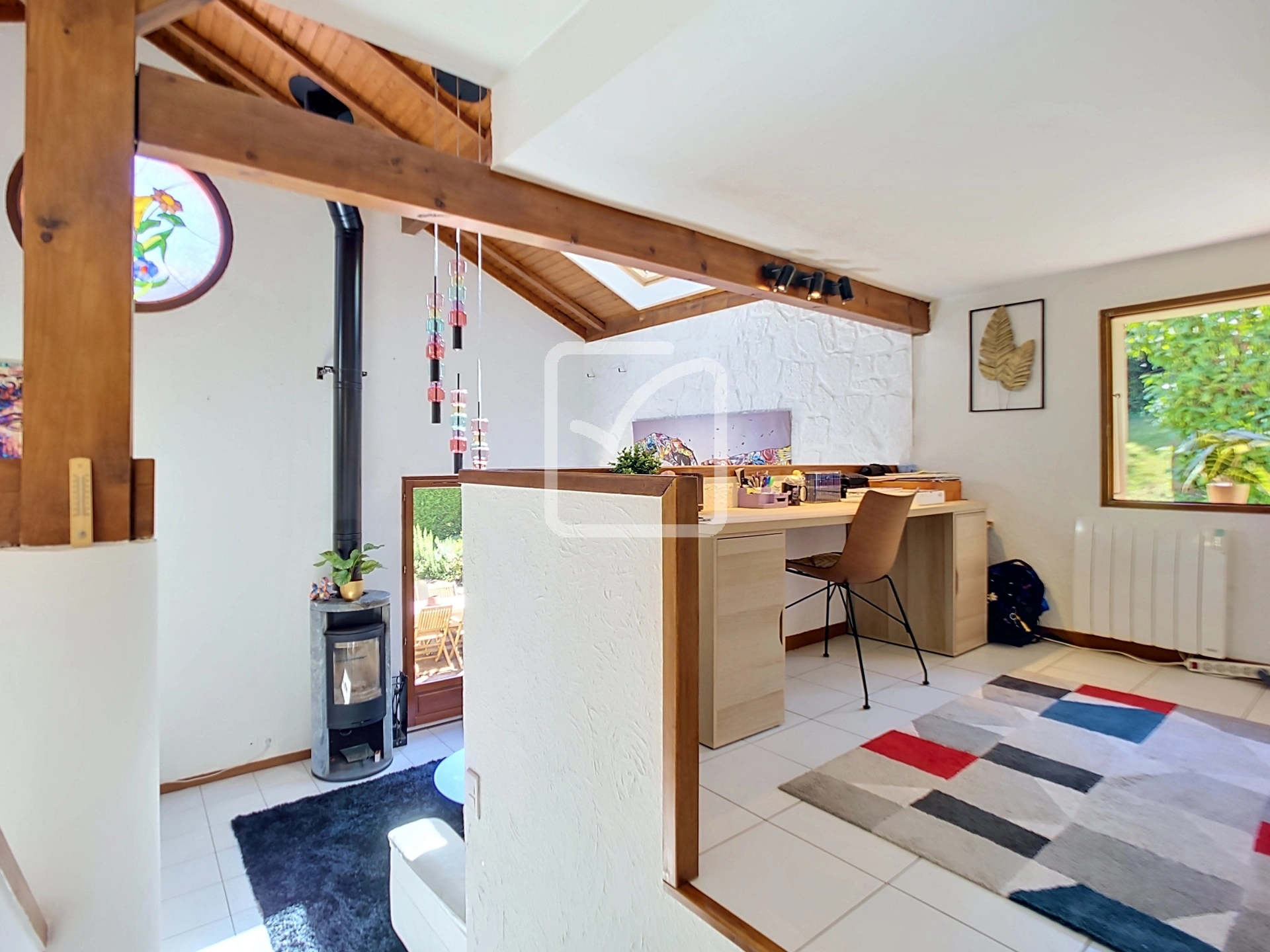 Ouvert sur une terrasse exposée sud et sans vis à vis, il est agrémenté d'un poêle à bois, élément décoratif propice aux moments chaleureux autour d'une flambée.