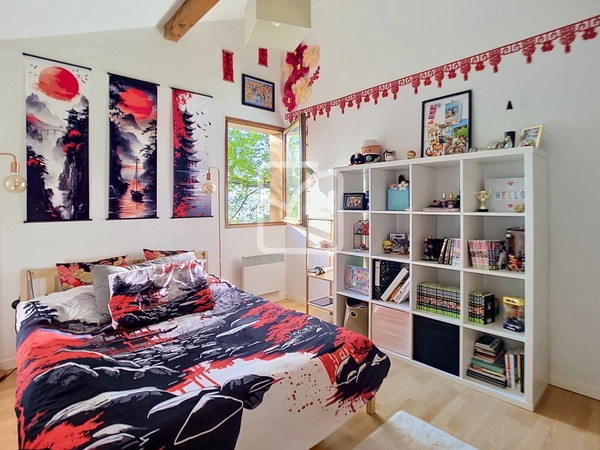 Au premier et dernier étage, l'espace nuit dessert trois chambres, dont un espace parental d'environ 20 m2 avec vue sur le lac, intégrant de nombreux rangements.