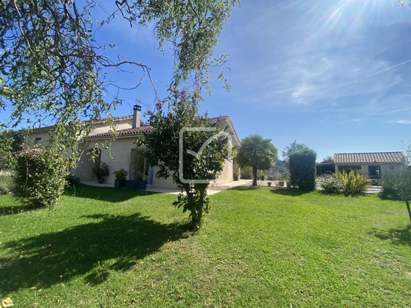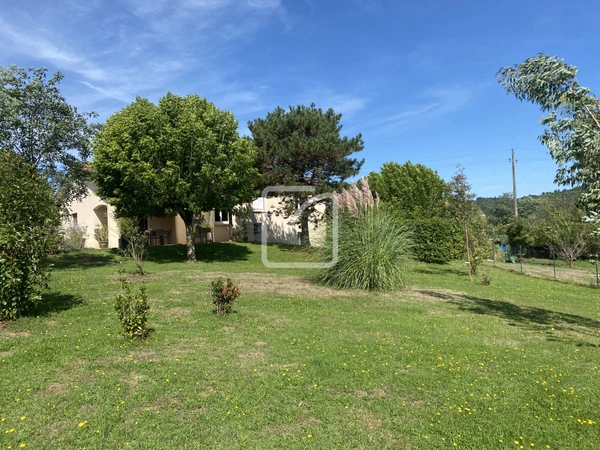 Dans un cadre verdoyant et paisible, à 10 minutes de toutes les commodités, cette belle propriété s'étend sur un terrain de 7500 m2 clôturé avec portail électrique agrémenté d'arbres fruitiers et d'essences ornementales. Depuis la maison vous profiterez d'un beau panorama dégagé sur la vallée et savourerez la quiétude de l'environnement. Ce joli bien propose également d'agréables espaces de loisirs et de confort : une piscine avec son pool house et sa cuisine d'été équipée d'un four à pain, un garage annexe avec partie atelier ainsi que diverses dépendances pratiques ( abris pour bois et outillage , poulailler...). La maison édifiée sur un sous sol semi-enterré permettant ainsi une vie de plain pied, soigneusement entretenue et décorée avec goût se compose de :