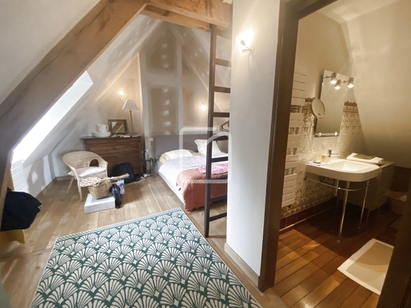 Au 1er niveau, 1 palier dessert 3 chambres dont 1 avec salle d'eau et 1 avec salle de bain tandis qu'au 2ème niveau le pigeonnier propose une pièce