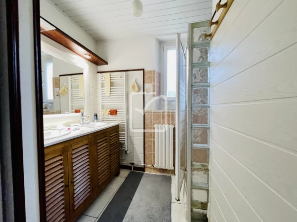 Trois niveaux : En rez de jardin vous trouverez une entrée ouvrant sur buanderie, garage et cave, ainsi que deux chambres et commodités. L'espace principal offre une cuisine ouverte sur le salon/ séjour et deux chambres . Sous les combles une cinquième chambre.