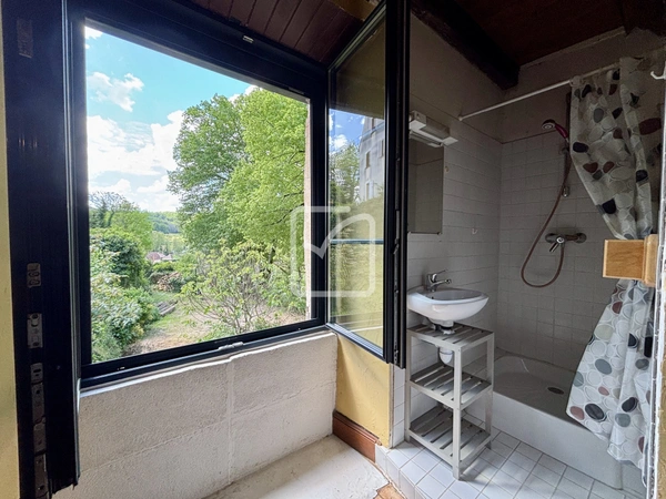 En rez de chaussée, vous découvrirez une cuisine ouverte sur le salon - séjour avec son poêle à bois et accés à la véranda lumineuse.