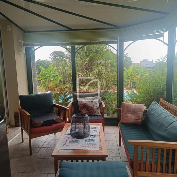 Cette pièce donne sur une belle véranda, qui surplombe le jardin et la piscine, idéale pour les apéros entre amis où pour créé une salle