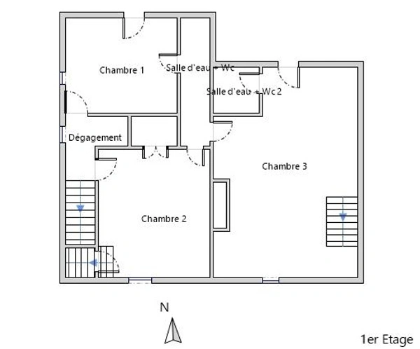 À l'étage, l'espace nuit se compose de trois chambres, accompagnées de deux salles d'eau et deux WC, offrant confort et praticité pour recevoir famille et invités.