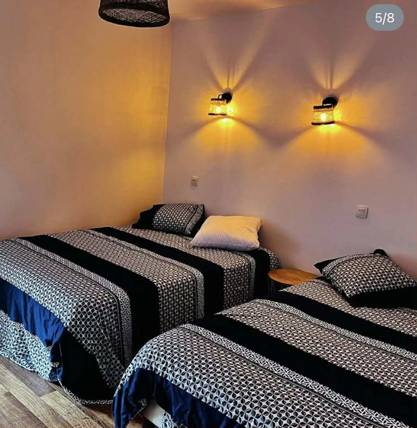 Un appartement de 70 m2 avec pièce de vie, séjour et son poêle à bois, deux chambres, salle d'eau, wc,