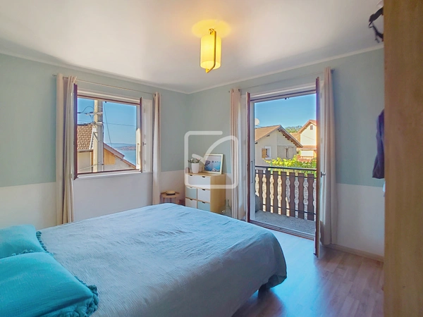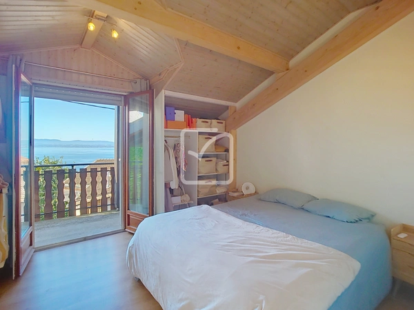 L'espace nuit en mezzanine comprend un bureau, ainsi que deux chambres dont une avec balcon offrant une belle vue sur le lac, et une seconde salle d'eau avec WC.