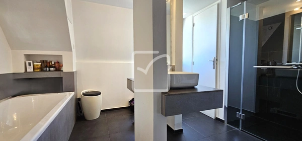 à l'étage 1: 3 grandes chambres parquetées dont deux de 18 m2 Salle de bain avec baignoire, douche et wc