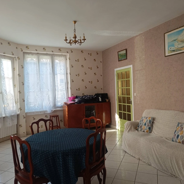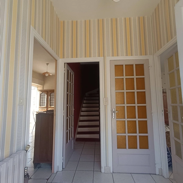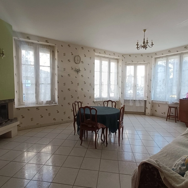 Nous entrons par un couloir qui dessert une belle pièce de vie lumineuse, agrémenté d'un insert.