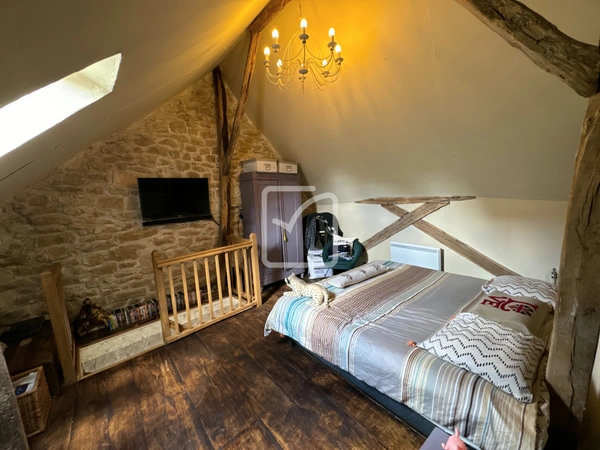 Imaginez-vous dans le salon baigné de lumière, où une cheminée au décor imitation béton ajoute une touche contemporaine à l'ensemble, créant ainsi un contraste saisissant entre tradition et innovation. L'escalier vous mène à l'étage, où la chambre à coucher vous accueille dans un écrin de douceur. Les sols en parquet et son mur en pierre se marient harmonieusement, tandis que les poutres en bois rappellent l'histoire de ce lieu empreint de caractère.