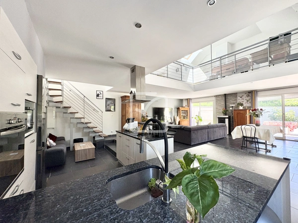 A l'étage, une mezzanine spacieuse, WC, deux chambres supplémentaires et une suite parentale avec grand dressing et salle d'eau privative. Les extérieurs vous offrent un terrain clos de 537 m2, une agréable piscine 7x3.