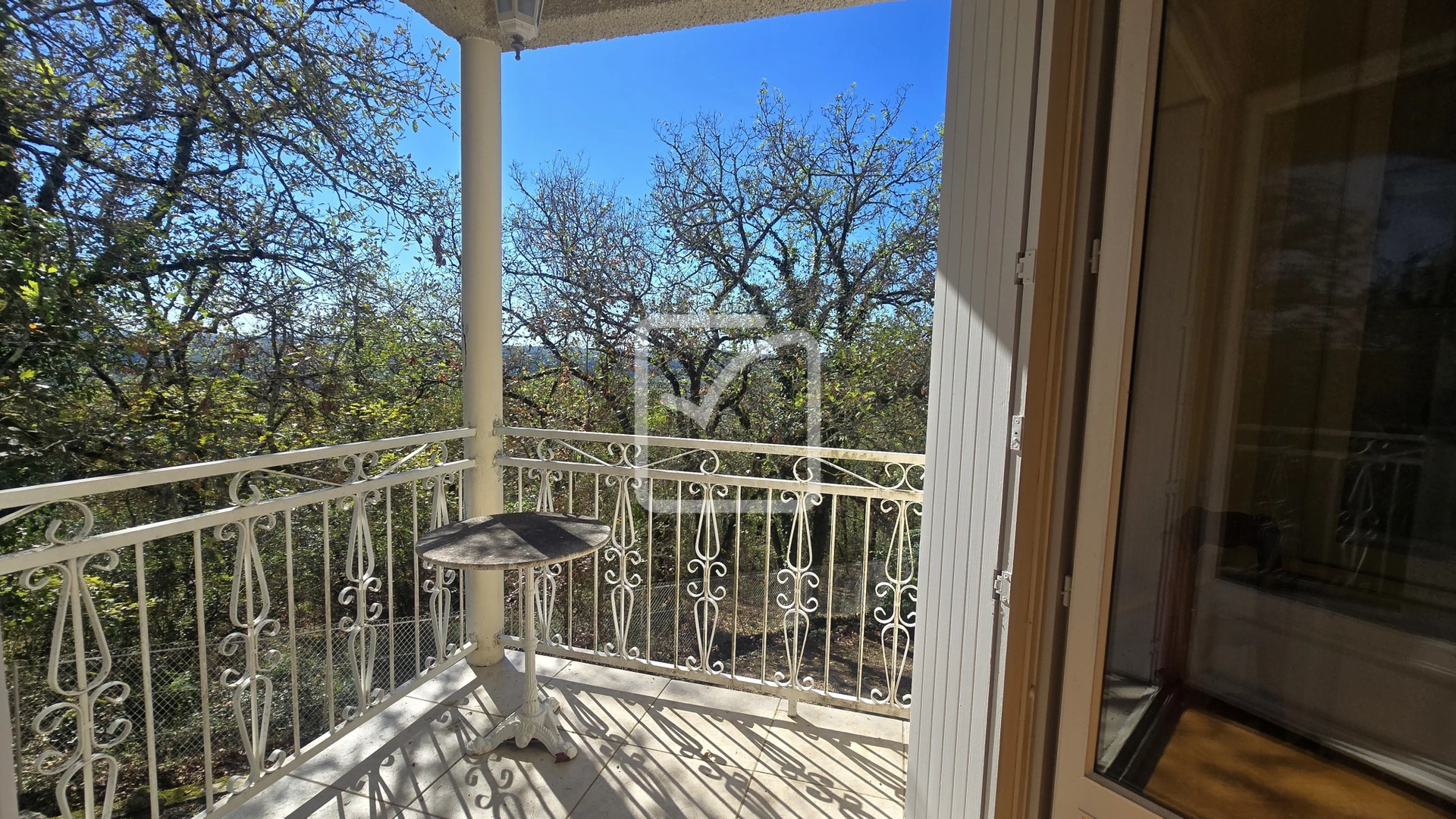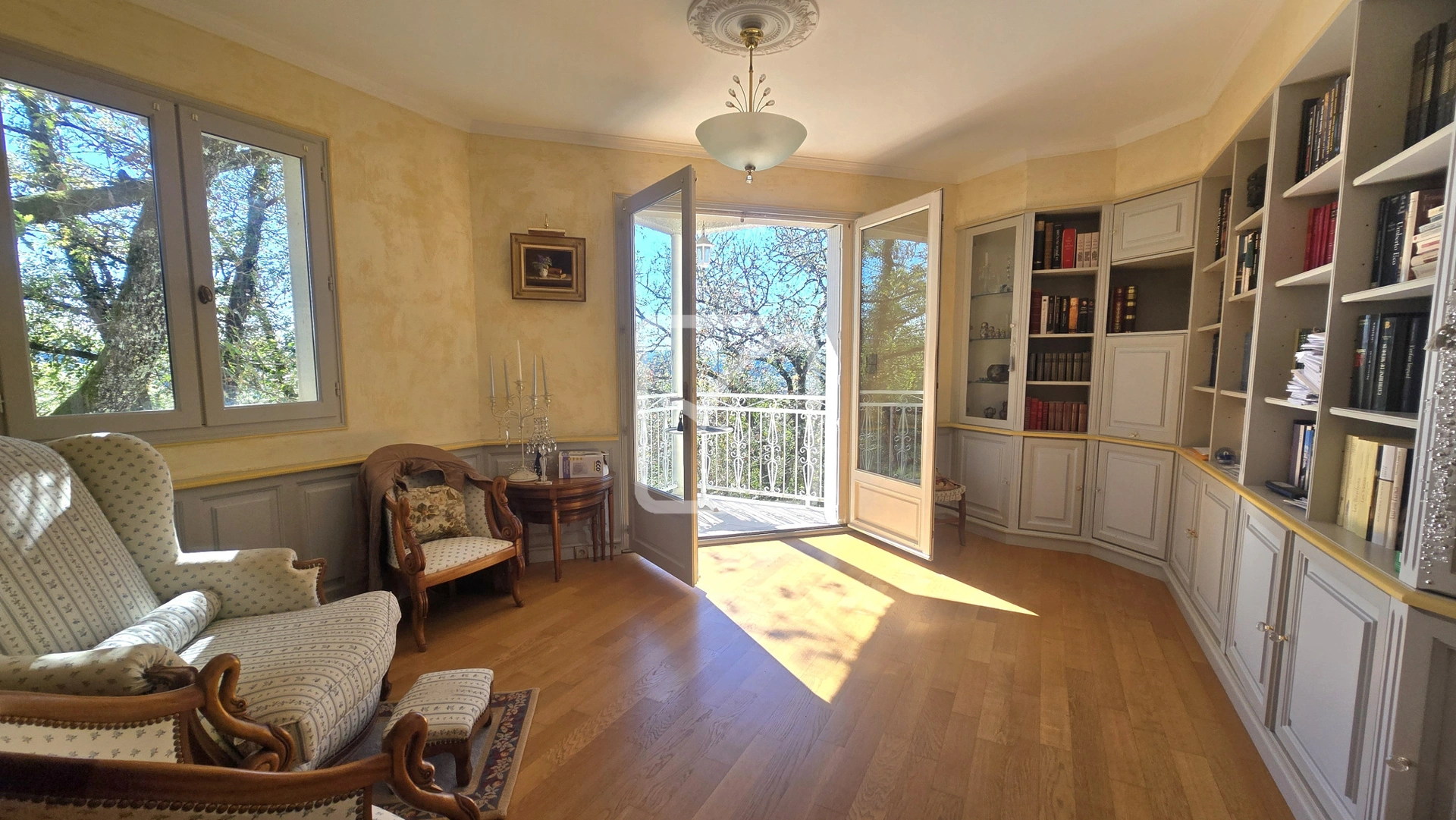 La partie principale offre une vie de plain-pied, comprenant un espace de vie lumineux, une cuisine équipée, ainsi qu'une chambre avec salle d'eau et wc et un espace bibliothèque avec balcon. Une véranda vient compléter ce niveau. L'étage dessert 3 chambres, un bureau, une salle de bain et un wc, offrant de beaux volumes.