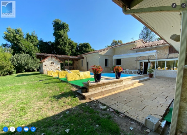 La demeure construite dans les années 60 a été agrandie et renové en 1995. vous aurez le loisir de la déorganiser et ainsi profiter de tous les volumes. Non moins de 4 chambres, une salle d'eau et salle de bain, une cuisine, et trois pièces de 45 m2 chacune aujourd'hui utilisées en salon, salle de sport et salle à manger/grill. Consommation énergétiques non exploitables. La dépendance offre deux niveaux avec leur terrasse couverte et une mezzanine à terminer. l'ensemble bien sera idéalement commercialisé avec un ensemble de matériel au prix de 480KEUR hai incluant tracteur, outils, tracto, stock de matériaux de rénovation, pisé ... 14800m2 de terrain paysagé. Un projet de vie à découvrir avec une lattitude pour les travaux de rénovation.