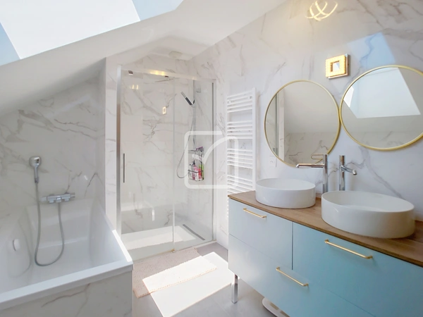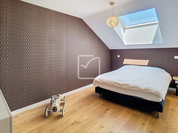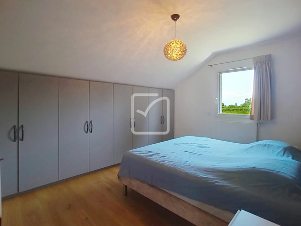 À l'étage, trois chambres avec rangements intégrés ainsi qu'une spacieuse salle de bains avec douche et WC offrent un espace nuit confortable et fonctionnel.