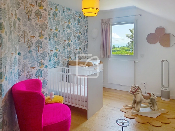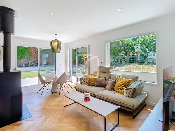 La maison bénéficie de prestations intérieures haut de gamme : chauffage au sol au gaz, poêle à bois, finitions soignées.
