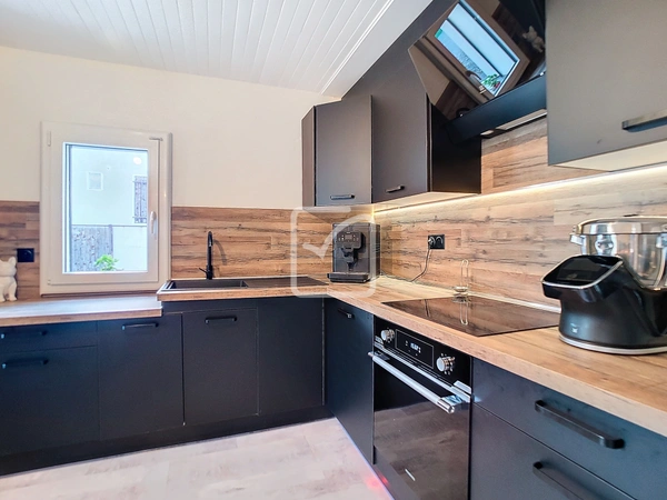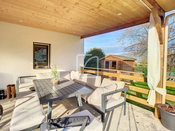 Au rez-de-chaussée, une cuisine neuve et entièrement aménagée s'ouvre sur une pièce à vivre, offrant un accès direct à une vaste terrasse de 40 m2 exposée plein sud. Cet espace extérieur, agrémenté d'une pergola et d'un salon de jardin, est parfait pour se détendre ou recevoir. Depuis la salle à manger, un escalier mène au sous-sol, où se trouve un salon cosy dédié à la télévision.