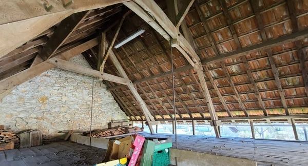 Elle se compose d'une habitation principale rénovée avec soin, d'une grange de caractère, d'un four à pain traditionnel, d'un garage ainsi que d'un hangar, le tout sur un terrain d'environ 2 100 m2.
