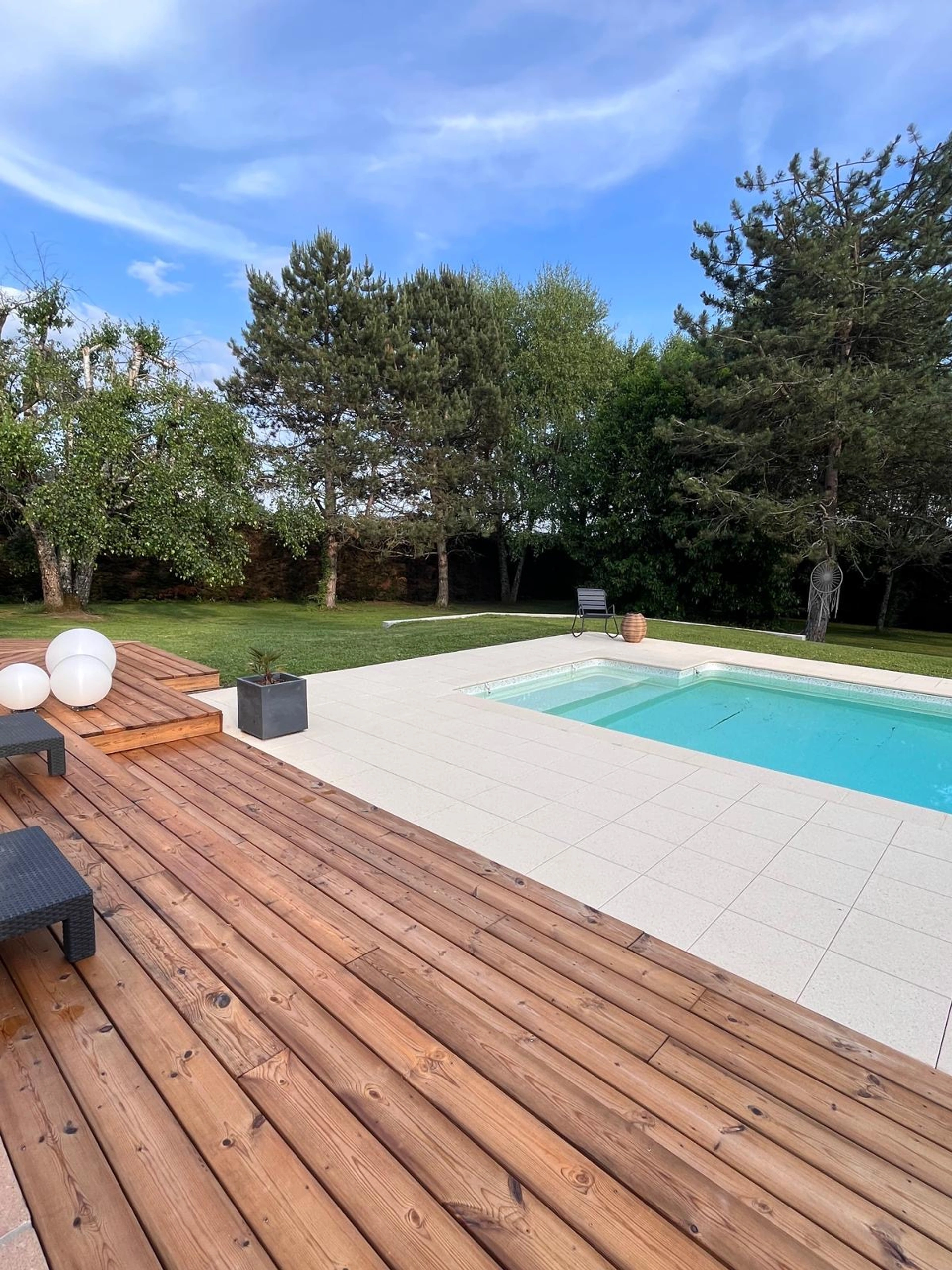 À l'extérieur, laissez-vous charmer par un joli parc paysager, une piscine 11x4 exposée plein sud, plusieurs terrasses, une allée privée, un parking goudronné, un abri de jardin de 20 m2, un garage et une cave.