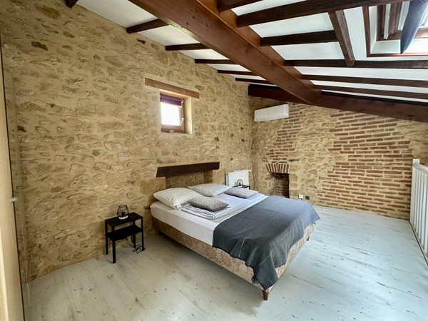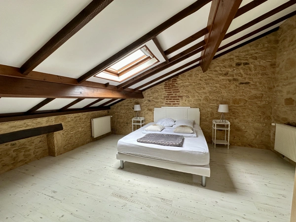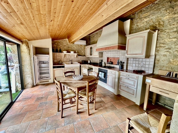 En plus de la maison principale, vous disposerez d'un gîte en pierre de 90m2 composé d'une cuisine donnant sur la terrasse, d'un salon, d'une salle d'eau avec WC et de deux chambres.