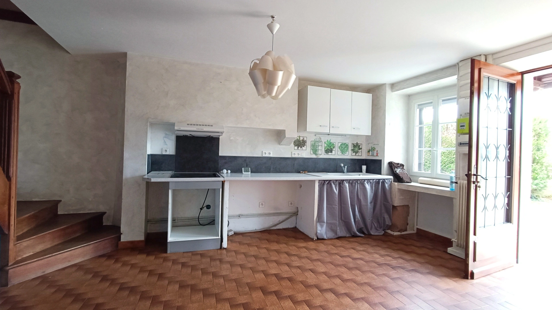 - au rez de chaussée : cuisine (16 m2 environ), salle à manger (17 m2 environ) et salon avec cheminée et poele à bois (environ 30 m2).