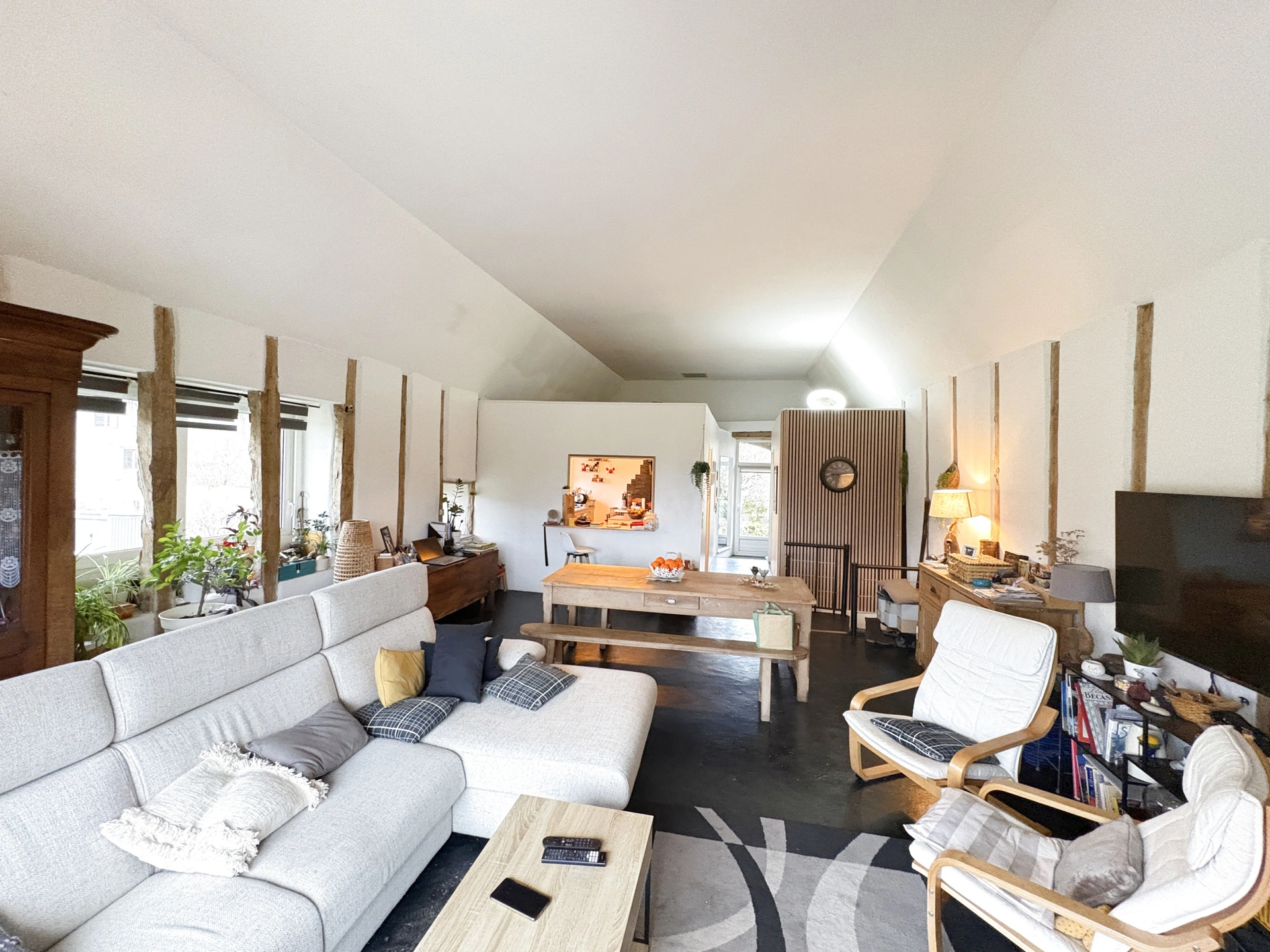 - une entrée avec vestiaire vous conduira vers la belle pièce de vie baignée de lumière avec de beaux volumes, ouvrant sur une terrasse avec vue dégagée sur la campagne environnante. Le poêle à granulés installé en 2025 apporte une note chaleureuse et permet de chauffer tout le niveau.