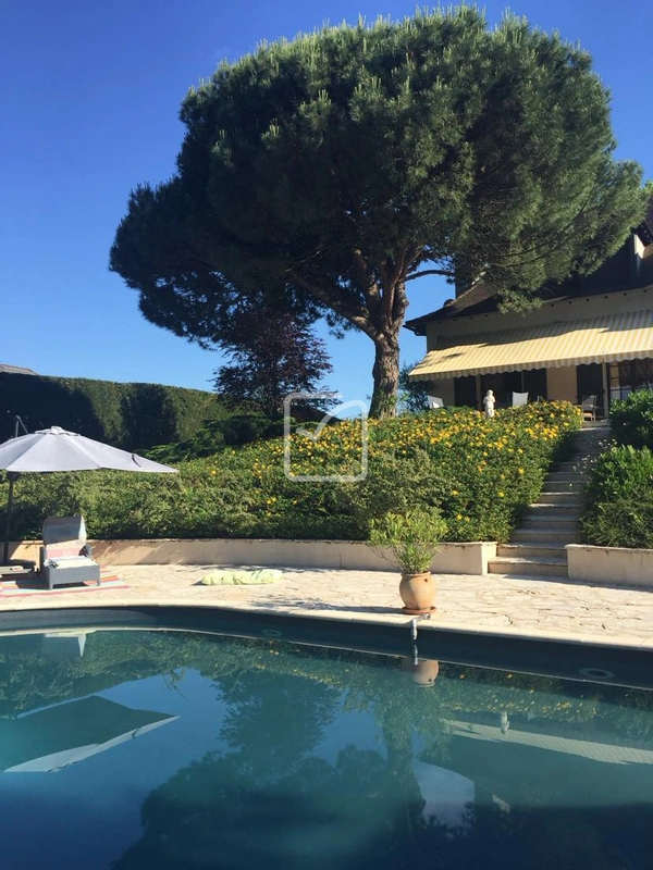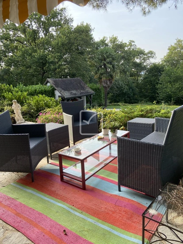Du charme côté jardin, grâce à une très grande terrasse en pierre donnant sur la piscine en contrebas (liner neuf) et le bois privé.