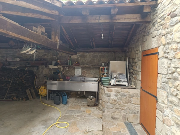 -Au RDC : une habitation principale de 130 m2 en plain pied avec une grande pièce à vivre lumineuse et très conviviale de 70m2, cheminée insert, cuisine ouverte en chêne avec bar bénéficiant d' une vue imprenable sur Aubenas et sur les Monts d'Ardèche, 3 chambres (12m2, 14m2 et 13 m2), une buanderie-chaufferie de 9 m2, une cour fermée de 532 m2 plein Sud agrémentée d'un magnifique érable et d'un très bel appentis en pierre construit en 2000 de 53 m2 avec sa cuisine d'été, un abri pour le rangement du bois de chauffage, une dépendance de 15 m2 environ à rénover. Côté Nord un balcon donnant accès à un petit jardinet clos, un appentis avec un lavabo et au sous sol une belle cave voutée de 22 m2 + 2 petites caves. Grand grenier aménageable de 127 m2 environ avec possibilité d'entrée indépendante. Chauffage central fuel année 2000, double vitrage (ancienne génération), volets bois. Une parcelle de 280 m2 pour jardin potager.